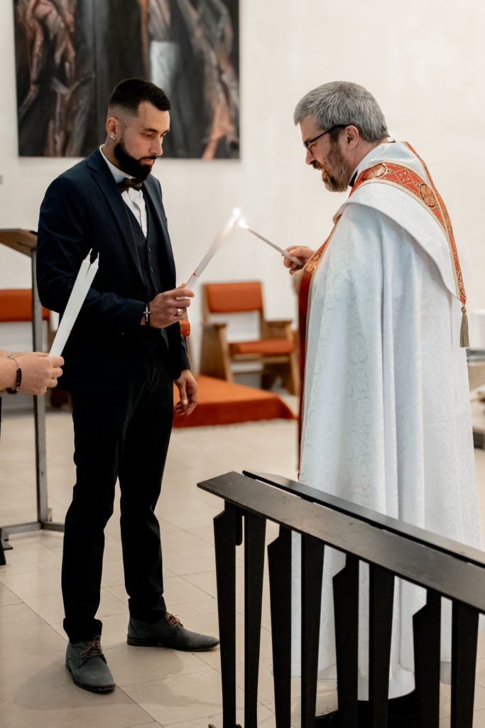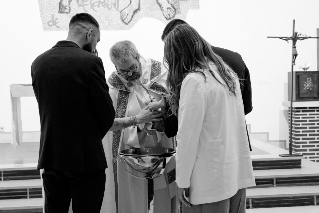 Je travaille en silence, sans flash intrusif quand cela n’est pas approprié, en me plaçant aux bons endroits pour ne pas gêner la vue des invités ou le déroulement de la cérémonie. Le prêtre et les participants ne remarquent presque pas ma présence, mais tous les moments importants sont capturés.